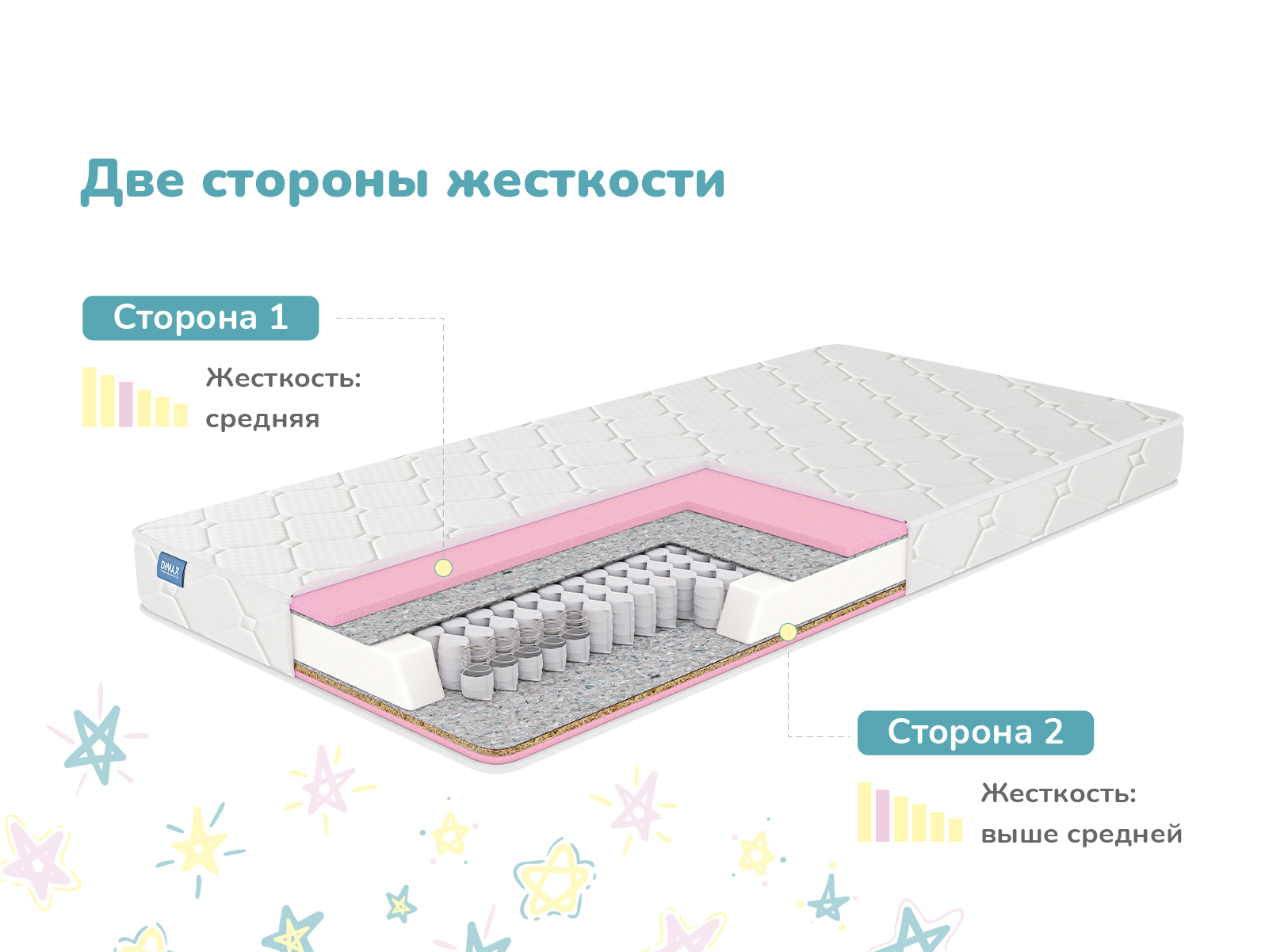 Матрас Димакс Галактика – удобная детская модель с двумя разными спальными сторонами. По мере роста ребёнка матрас можно переворачивать и менять уровень жёсткости спального места с более высоких значений на более мягкие. В основе модели – прочный независимый блок пружин, который обеспечивает правильную поддержку и здоровый сон.