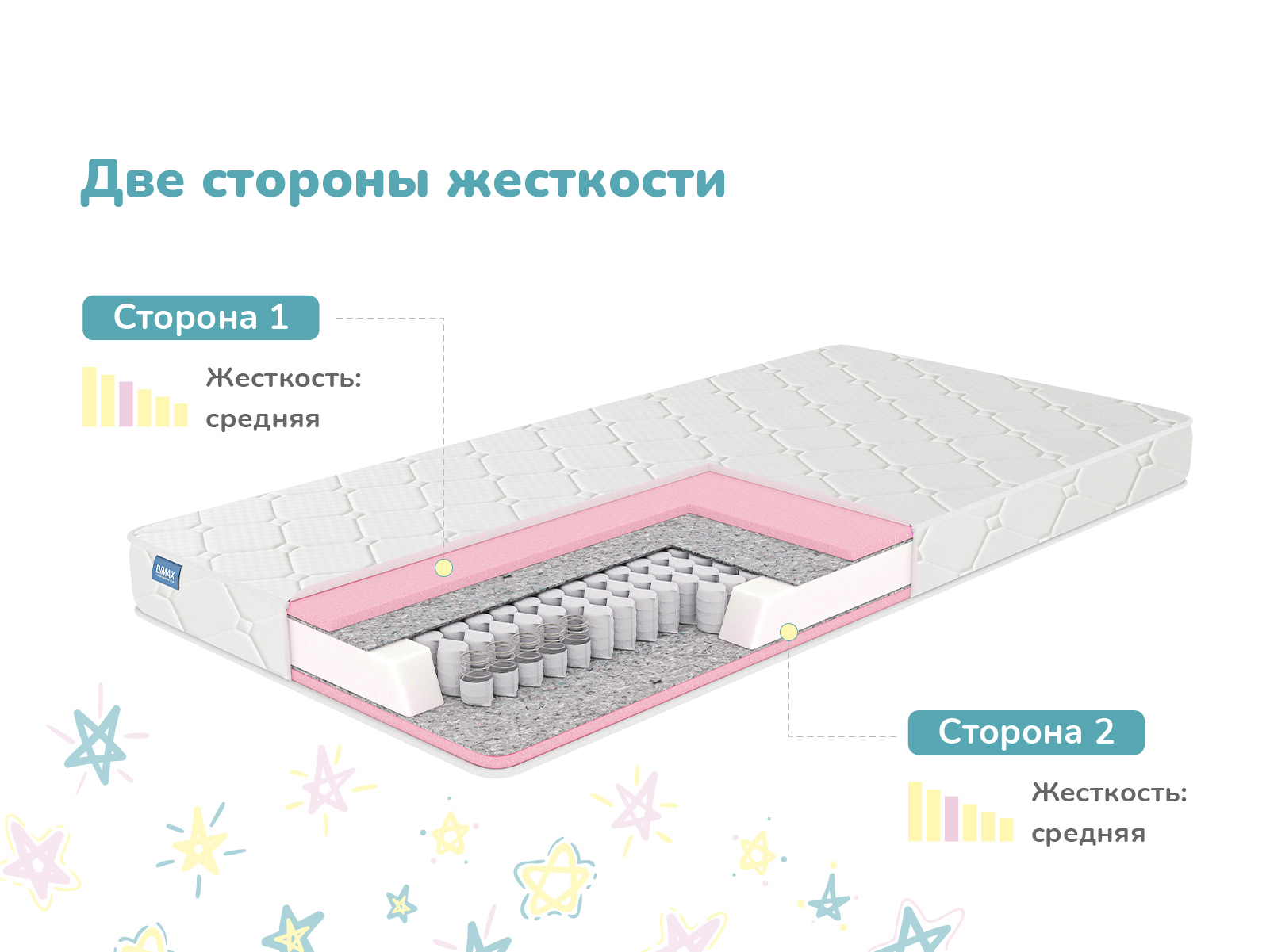 У данной модели стандартный - средний уровень жёсткости. Модель можно переворачивать и пользоваться любой из спальных поверхностей.