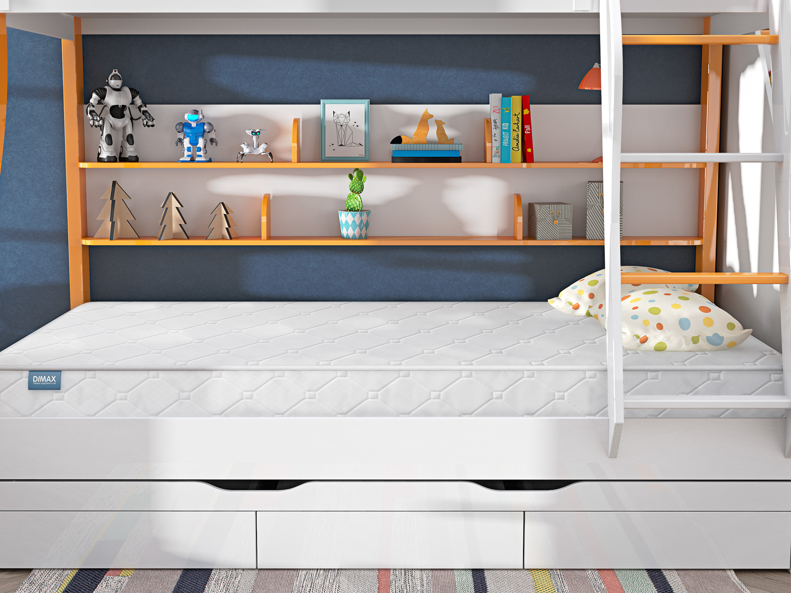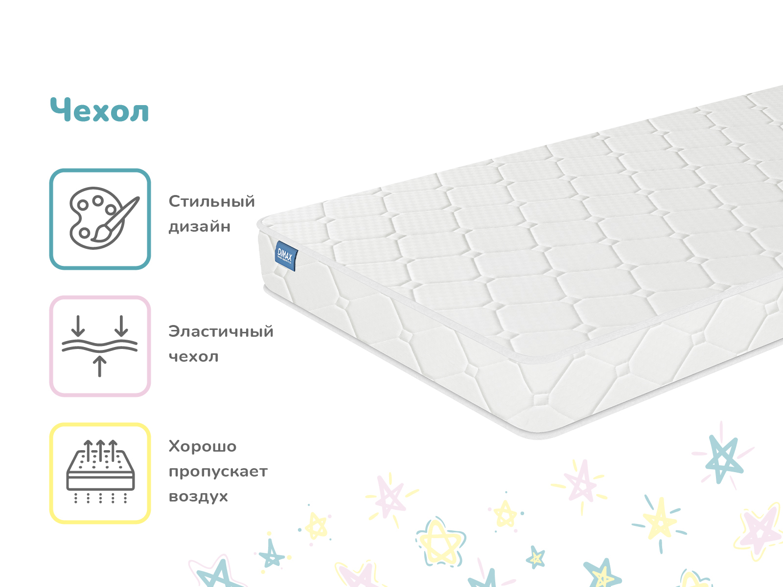 Внутри детского матраса Димакс Звезда находится качественный блок независимых пружин, который позволяет выдерживать нагрузку до 80 кг на спальное место. В состав модели входят только сертифицированные и гипоаллергенные наполнители. Матрас имеет практичный уровень жёсткости сторон – средний и выше среднего.