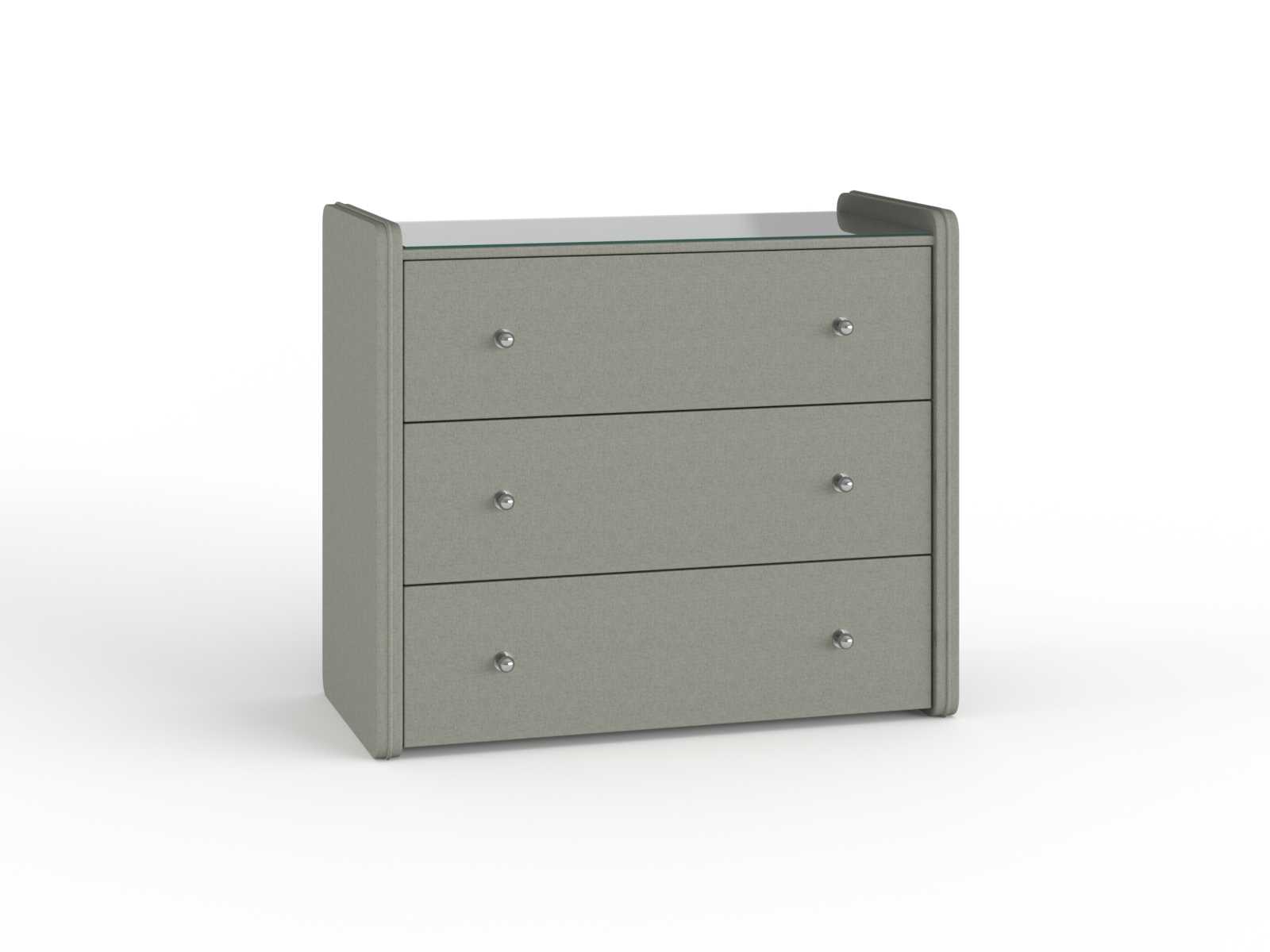 Стильный комод с тремя ящиками станет не только частью декора спальни, но и полезным функциональным дополнением интерьера вашей комнаты. Вместительные ящики для белья позволят практично разместить спальные принадлежности и аксессуары. На стеклянной столешнице расположится ночник, ваши любимые рамки с фотографиями, а широкая палитра расцветок обивки комода из экокожи, велюра или рогожки позволит ему органично вписаться в любой интерьер